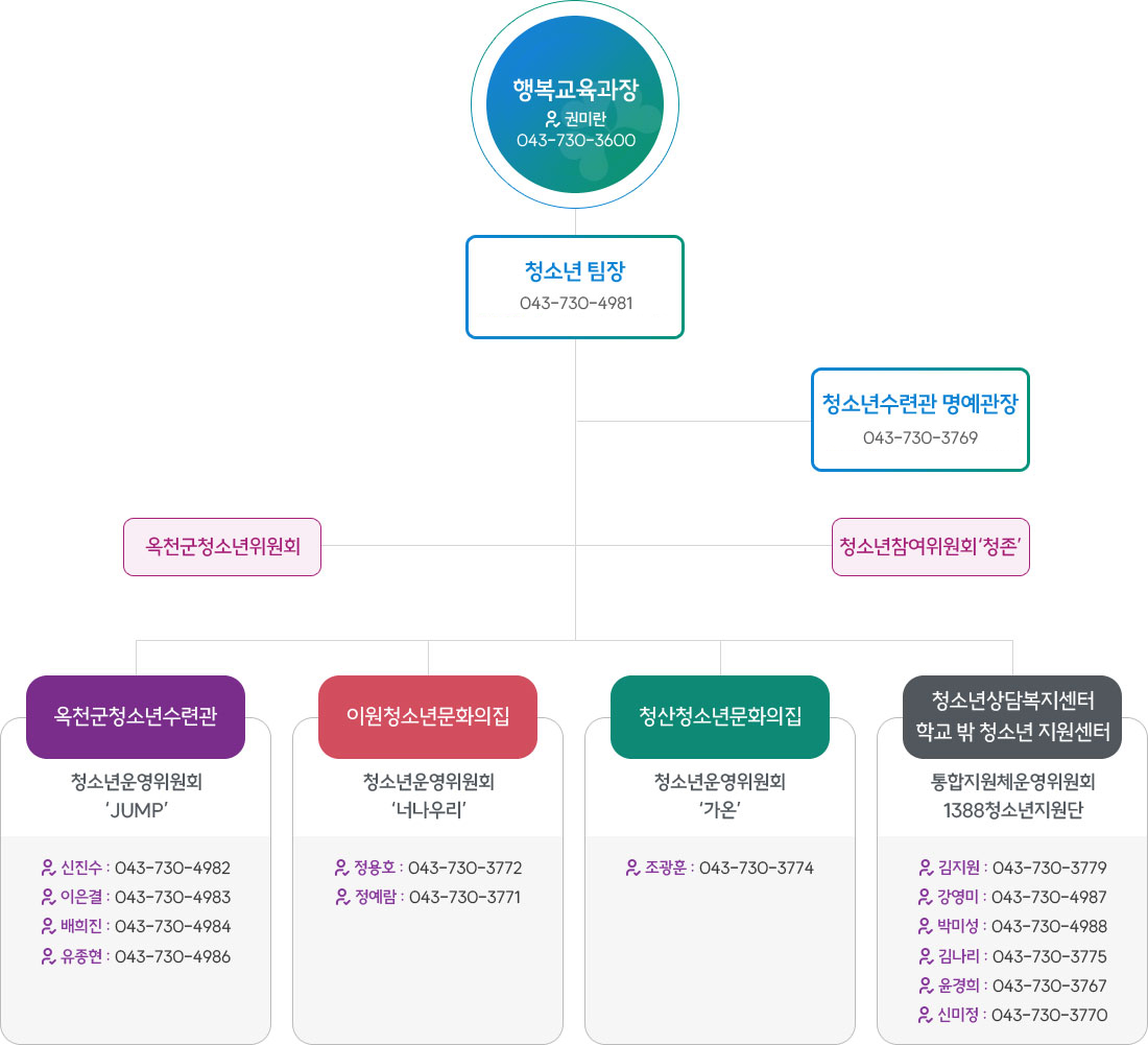 옥천군 청소년 수련관 조직을 성함과 연락처와 함께 자세하게 안내합니다.